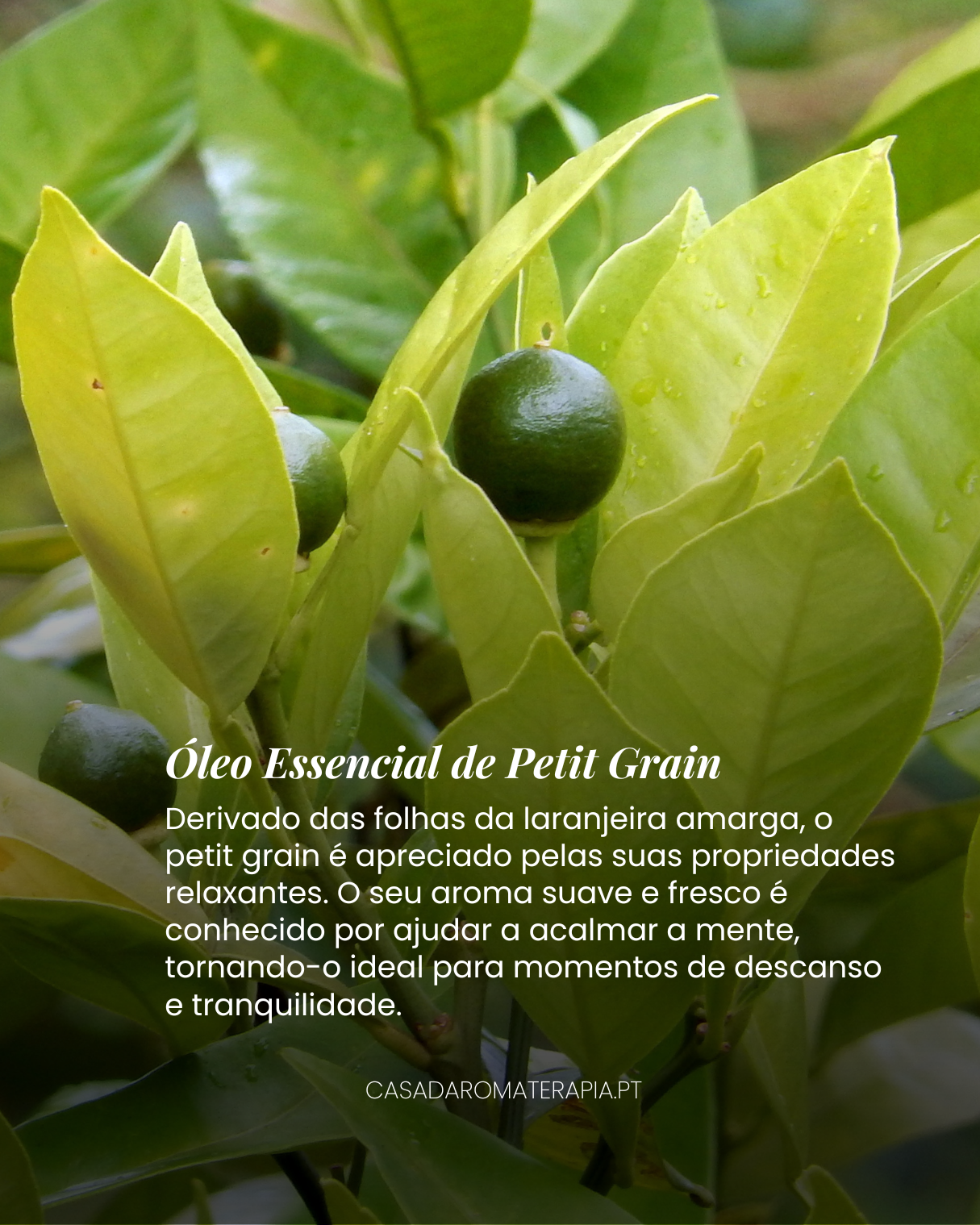 Derivado das folhas da laranjeira amarga, o petit grain é apreciado pelas suas propriedades relaxantes. O seu aroma suave e fresco é conhecido por ajudar a acalmar a mente, tornando-o ideal para momentos de descanso e tranquilidade.