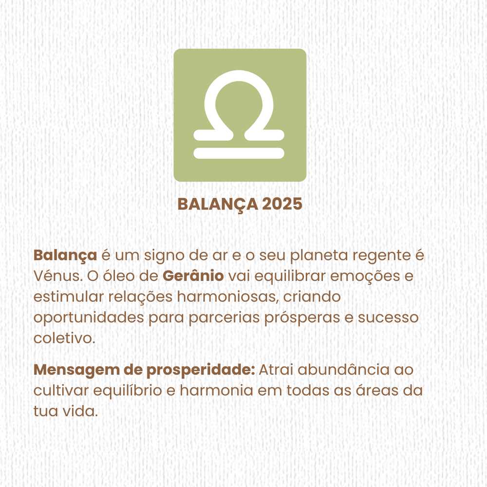 Os nativos de Balança, reconhecidos pelo seu charme, busca de equilíbrio e harmonia, terão no óleo essencial de Gerânio o suporte perfeito para um ano cheio de prosperidade e serenidade. Este óleo é conhecido por promover estabilidade emocional, confiança e bem-estar, alinhando-se com a essência pacificadora de Balança.