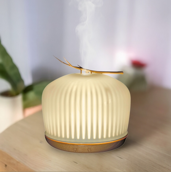 Com base em madeira certificada e cúpula em vidro soprado, este difusor não é apenas um aparelho funcional – é uma peça decorativa que eleva o ambiente. Sua luz suave e difusão delicada dos óleos essenciais promovem relaxamento, equilíbrio e acolhimento em qualquer espaço da casa.