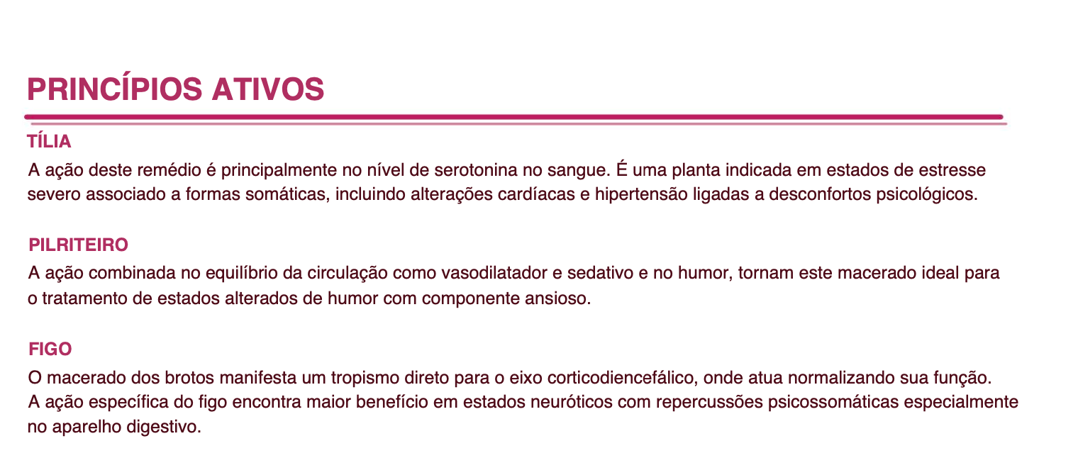 Composição ativa: Macerados glicérico-alcoólicos de botões de tília, brotos de espinheiro e figo