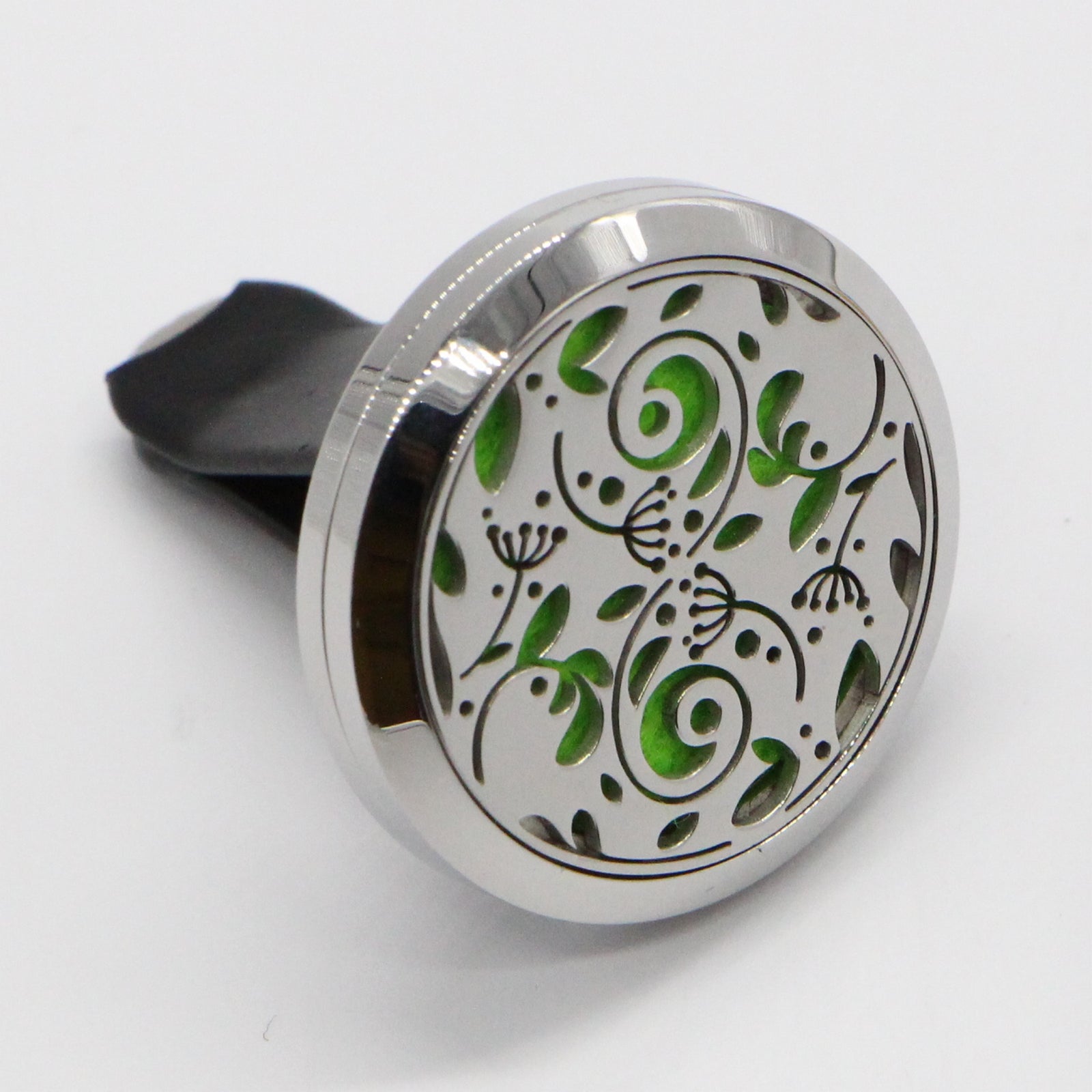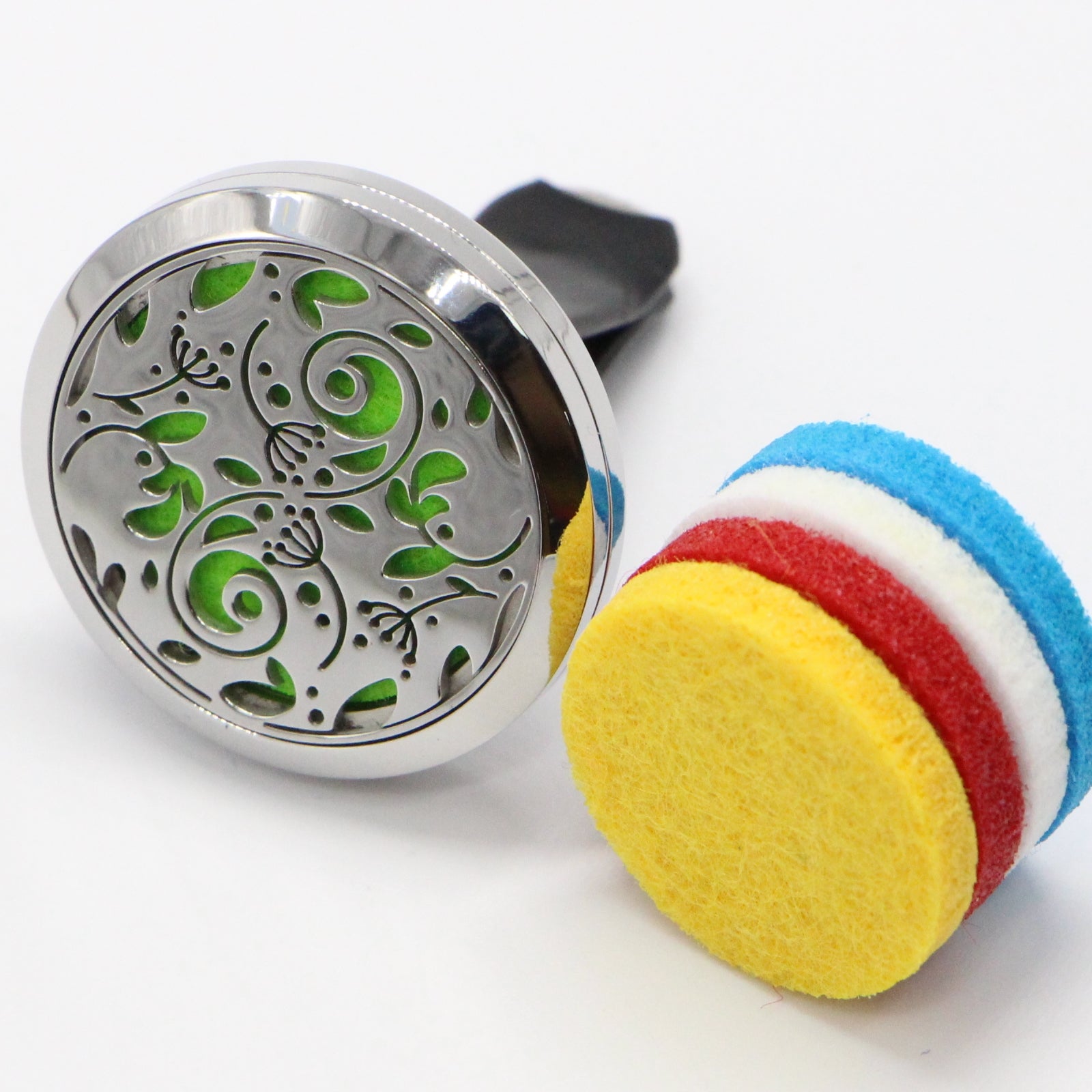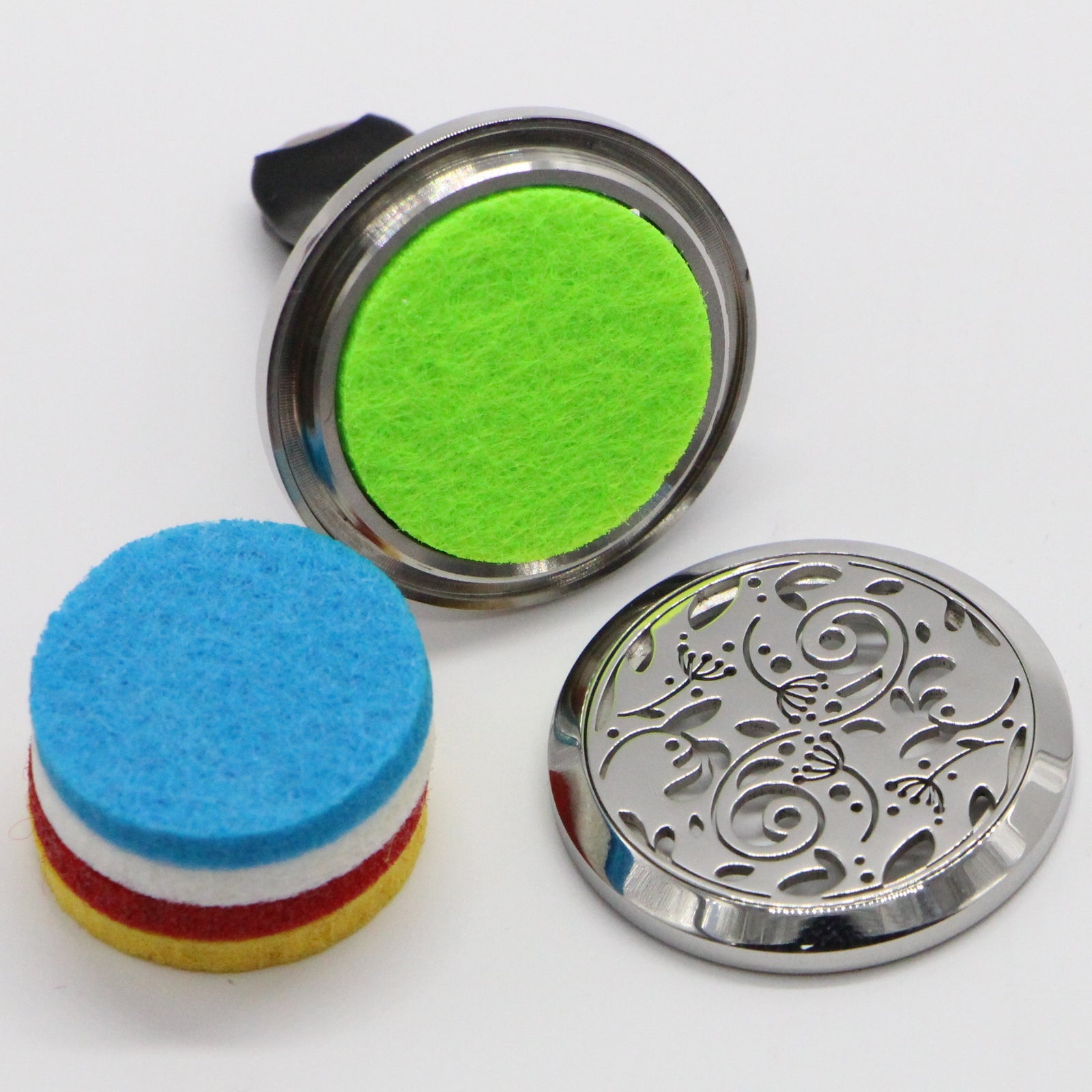 Le médaillon contient un tampon de feutre sur lequel quelques gouttes d'huile essentielle peuvent être appliquées.