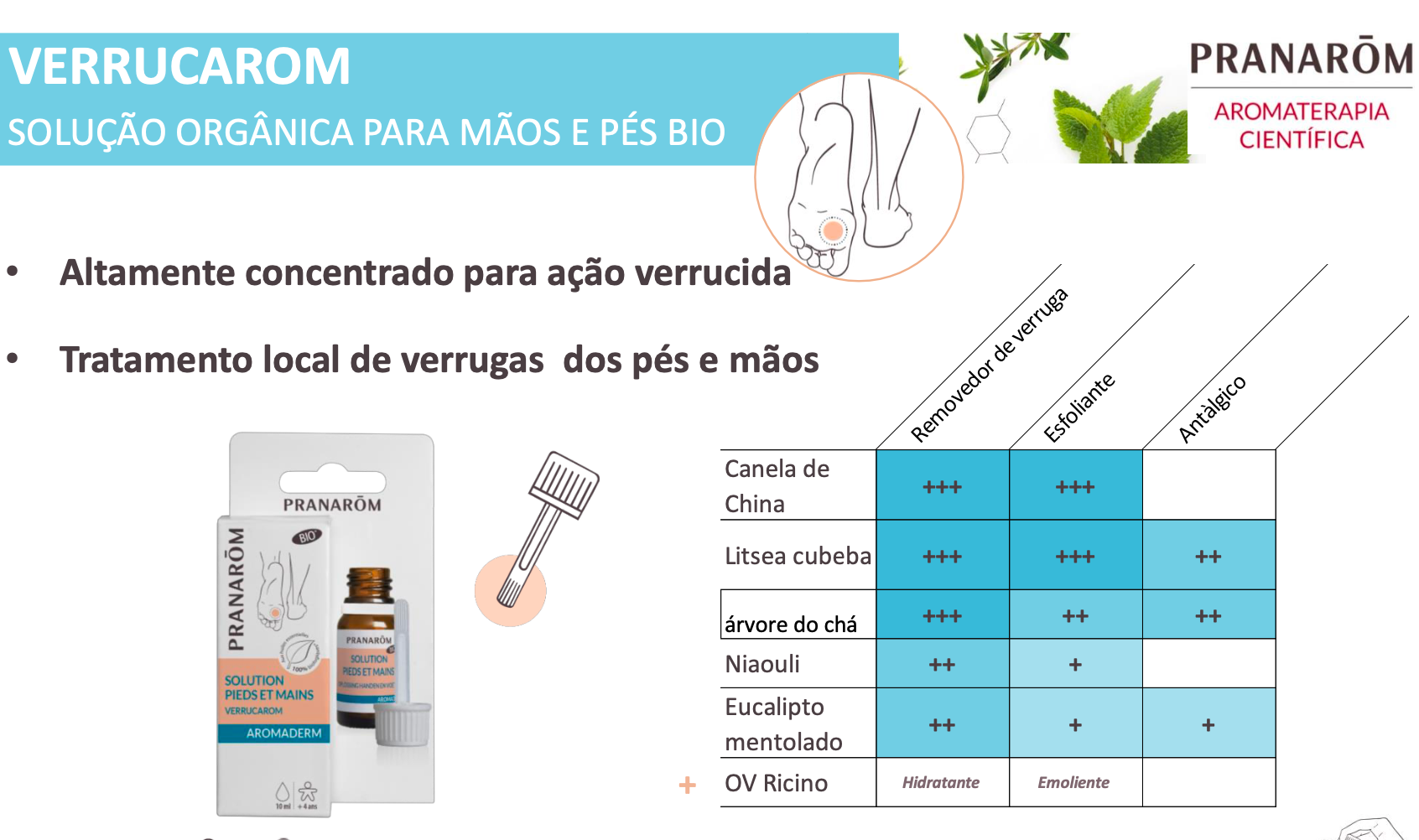 Graças à combinação de óleos essenciais biológicos como Canela da China, Tea Tree, Niauli, Eucalipto mentolado e Litsea cubeba, e ao óleo vegetal de rícino, o Verrucarom promove a eliminação progressiva da verruga, estimula a regeneração da pele e previne a proliferação de agentes causadores. Um cuidado completo, prático e eficaz para um problema comum, tratado com o poder da natureza.