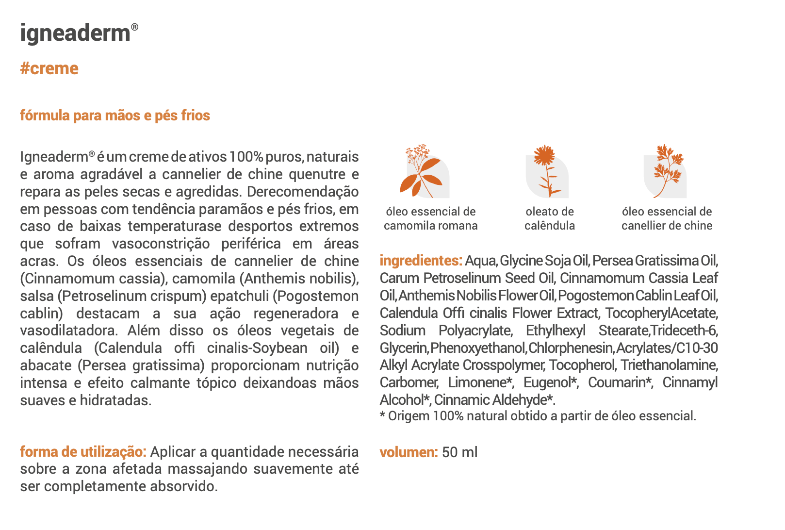 Igneaderm® é um creme de ativos 100% puros, naturais e aroma agradável a canela da China que nutre e repara as peles secas e agredidas.