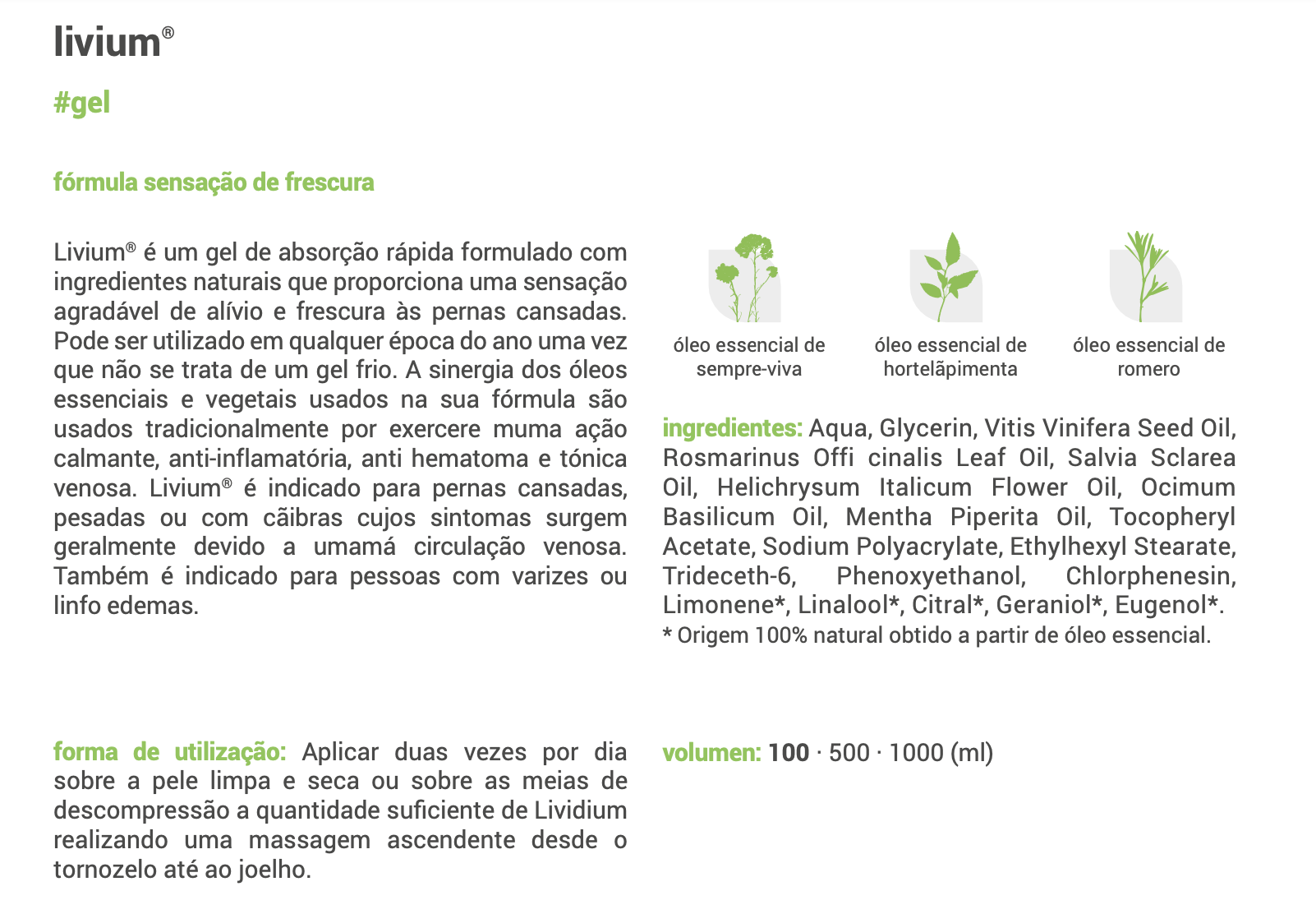Indicado também para casos de varizes, cãibras noturnas e linfedemas, Livium® é um excelente complemento à rotina de quem passa longas horas em pé, sentado ou utiliza meias de compressão.