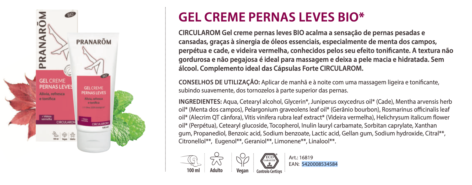 O Gel Creme Circulação BIO da Pranarôm é a escolha ideal para quem sofre com pernas pesadas, inchadas ou cansadas ao final do dia. Formulado com óleos essenciais de menta do campo, immortelle e cade, aliados ao poderoso extrato de videira vermelha, este gel proporciona um efeito refrescante e tonificante imediato.